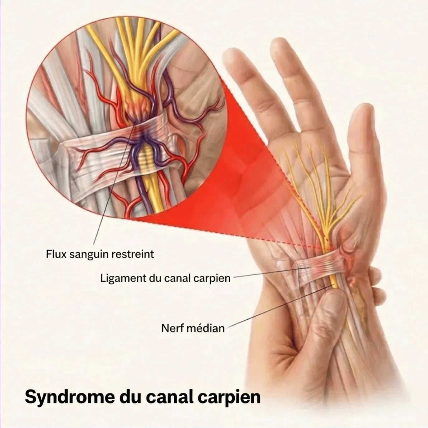 Le vrai problème se joue à l'intérieur de votre poignet : l'inflammation chronique comprime le nerf médian — celui qui donne à vos doigts leur sensibilité et leur force. Cette compression bloque la microcirculation sanguine. Sans circulation, les tissus ne se réparent pas. Sans réparation, l'inflammation persiste. Et le cycle recommence — chaque nuit un peu plus fort.