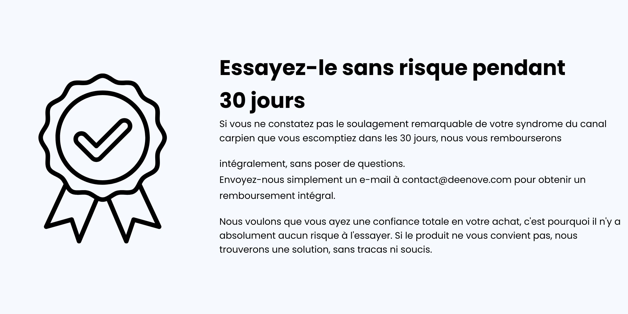 C'est exactement pour ça que la garantie existe. Vous avez 90 jours pour tester le RedNove™ dans votre quotidien — vos nuits, vos mains, votre poignet. Si rien ne change, un simple email à contact@deenove.com suffit : remboursement intégral, sans justification. Vous ne prenez aucun risque. Le seul risque, c'est de ne rien essayer pendant que le cycle continue de s'aggraver chaque nuit.